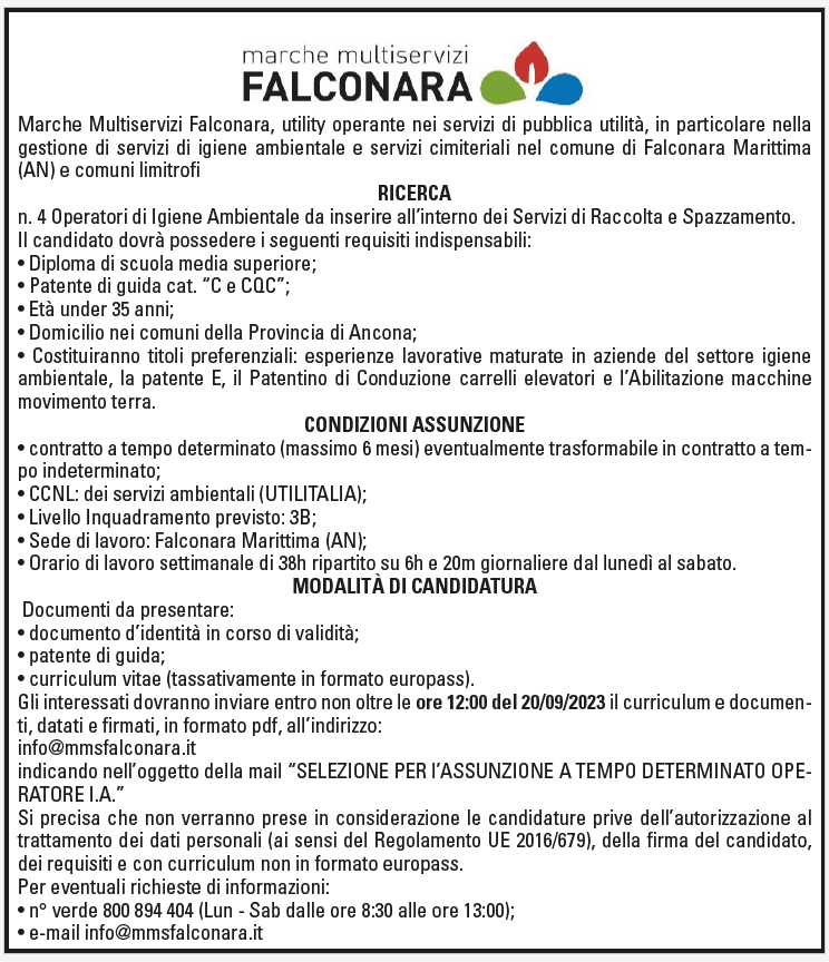 Comunicati di Servizio/Stampa Marche Multiservizi Falconara ricerca personale! Pubblicazione: 04.09.2023 Categorie: Comunicati stampa,Comunicati di servizio